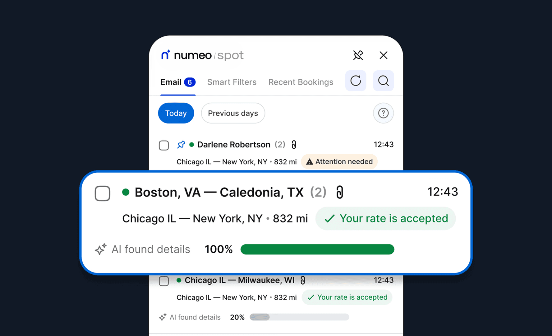 Numeo Spot (formerly LoadOps) adds email, profit checks, AI follow-ups, and market intel directly on your load board—so you move more freight with the same team.